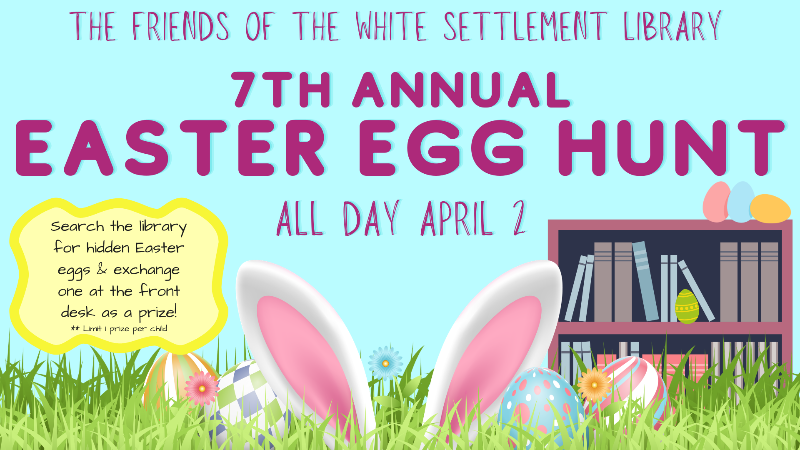 Hop on over to the White Settlement Public Library on Thursday, April 2 for a fun-filled Easter Egg Hunt! Kids under 18 can visit the library anytime during regular hours to hunt for a hidden Easter egg. Once you find it, bring it to the front desk to exchange it for a festive prize!