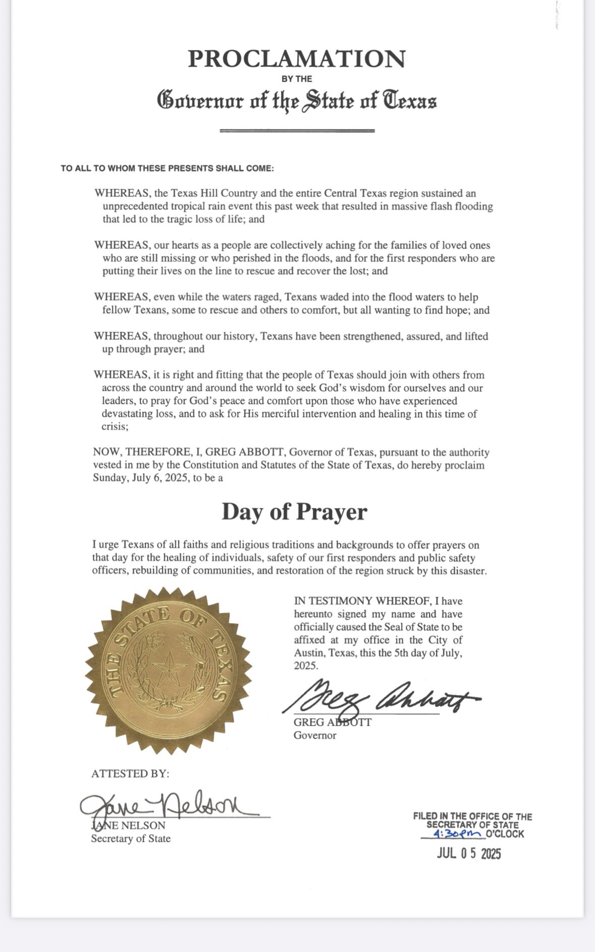 Texas Gov. Greg Abbott has declared Sunday, July 6, as a Day of Prayer in Texas in response to the floods in the Hill Country.