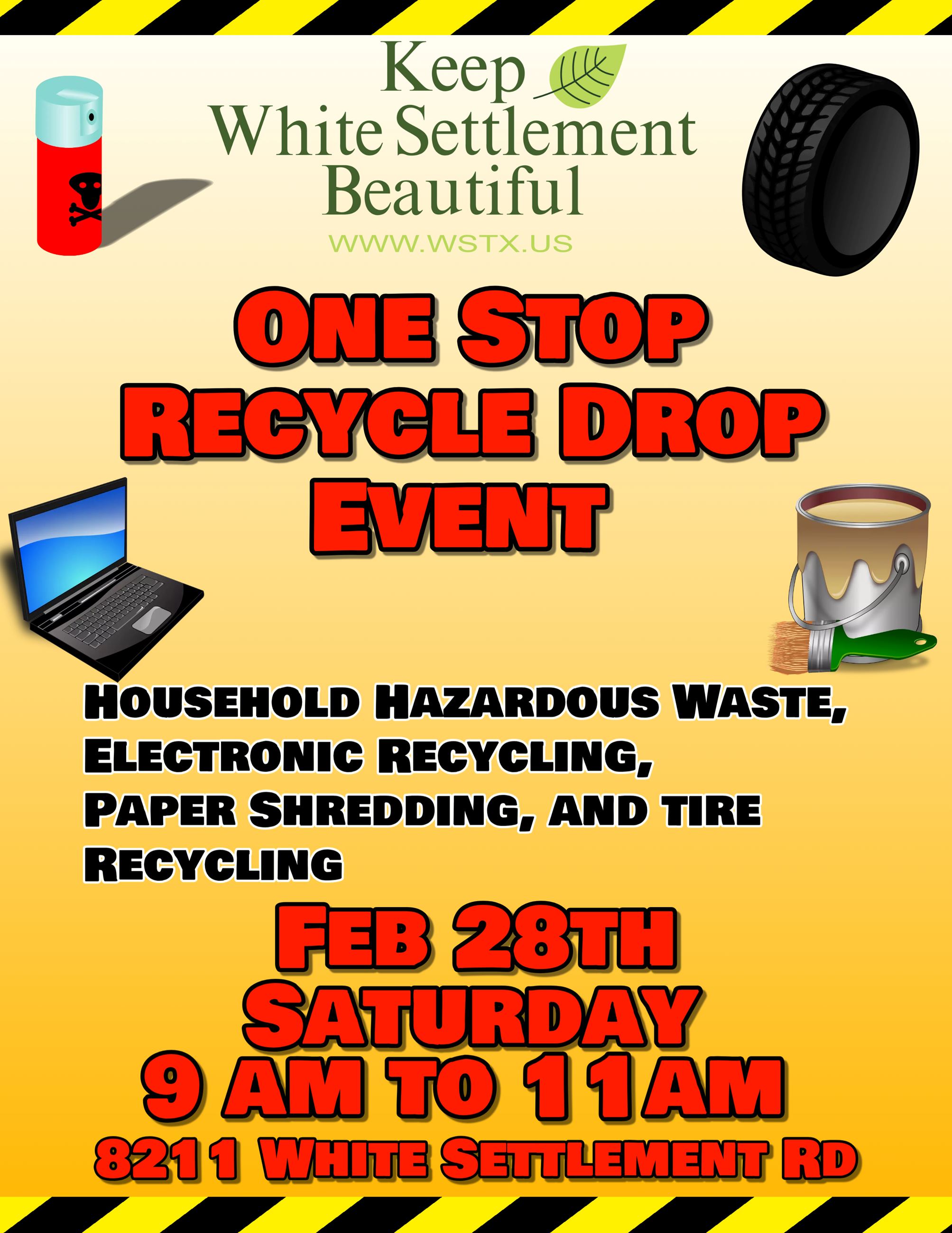 Hey there! We'd love for you to join us at the Municipal Complex (8211 White Settlement Rd) on February 28th from 9 am to 11 am for a fun recycling event. We'll be accepting household hazardous waste, paper for shredding, tires (up to 4 per household without rims—just regular car tires, no tractor or big tires), and electronics recycling—all happening at the same time! This is just for White Settlement residents, so be sure to bring your latest water bill to drop off items.